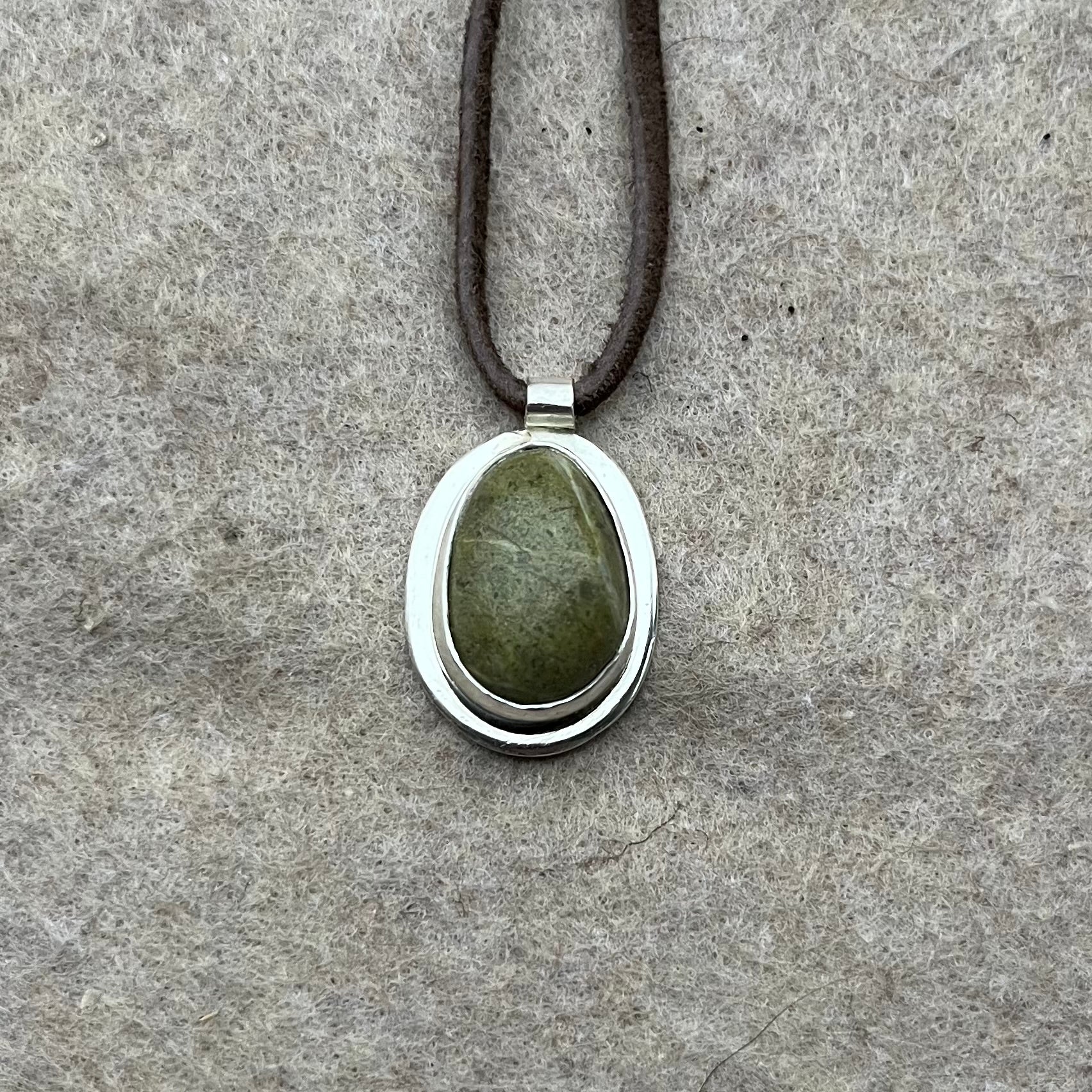 A natural stone picked from a beach on Haida Gwaii in August of 2025. This stone holds all the magic of the sacred place it came from. Set in 925 Sterling Silver and on a suede cord, this pendant is earthy, sturdy and will withstand the test of time.