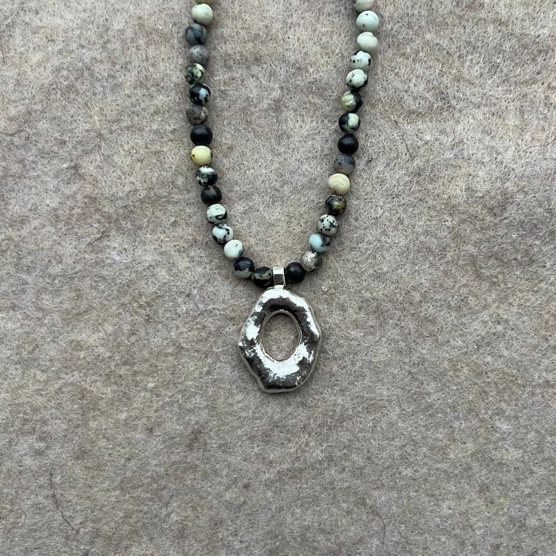 A chunky, organic pendant made from recycled 925 sterling silver on a beaded moonstone choker.
